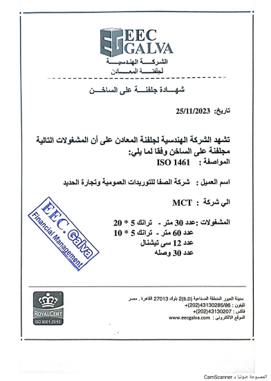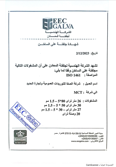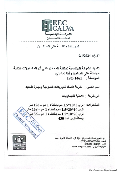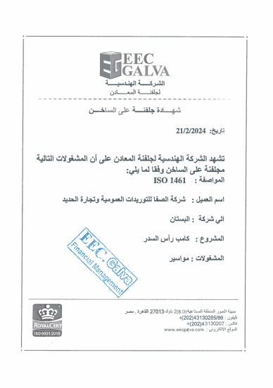 الشهادات والاعتمادات شركة الصفا لتجارة وتشكيل المعادن من الشركات الرائدة في مصر في مجال تشكيل المعادن وتصنيع حوامل الكابلات والغرابيل واحوامل الرخام قامت الشركة بتنفيذ عدد مشروعات للشركات العامة والخاصة علي مستوي جمهورية مصر العربيه مشروع ابراج مدينة العلمين الجديدةالمشاريعالخبرةعدد المبيعاتعدد العملاء